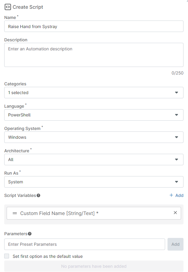 Now that we have a custom field, we need a script to update it. NinjaOne’s very own Jeff Hunter built a really cool script that updates a custom field with a hand emoji, and automatically clears it after 3 minutes. We can then use the device grid to search for devices with that symbol in the custom field. Of course, you can always write your own script if you prefer.