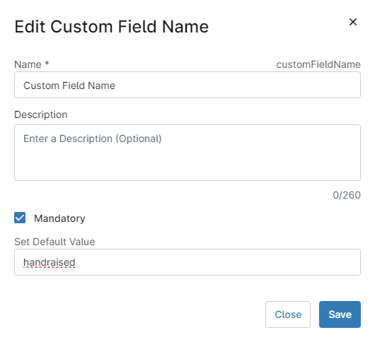 - Finally, fill in the “Set Default Value” with the name of your custom field. In this example we used “handraised.”