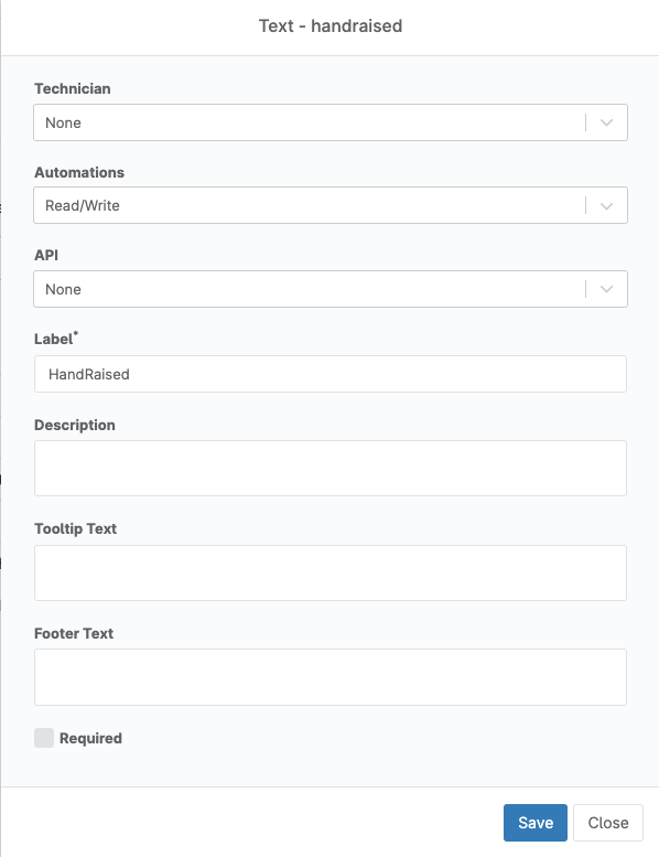 - Fill in Label and provide a Name. The Name is what the field is referred to internally and how we will access it in our script. We set the label to ‘HandRaised’ and the field name will autofill with that same name. But you can change the field name if you want.