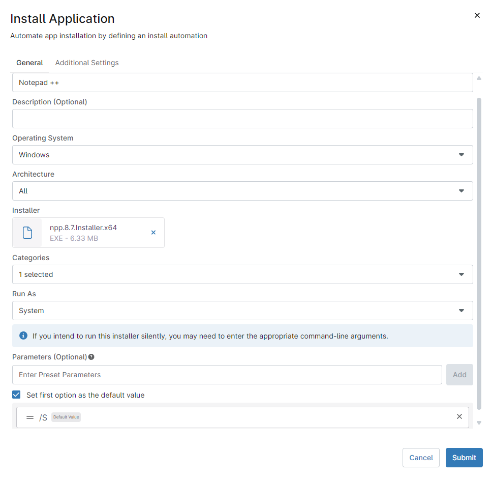 First, build an Install Automation. We included a screenshot of an example automation that silently installs Notepad ++.