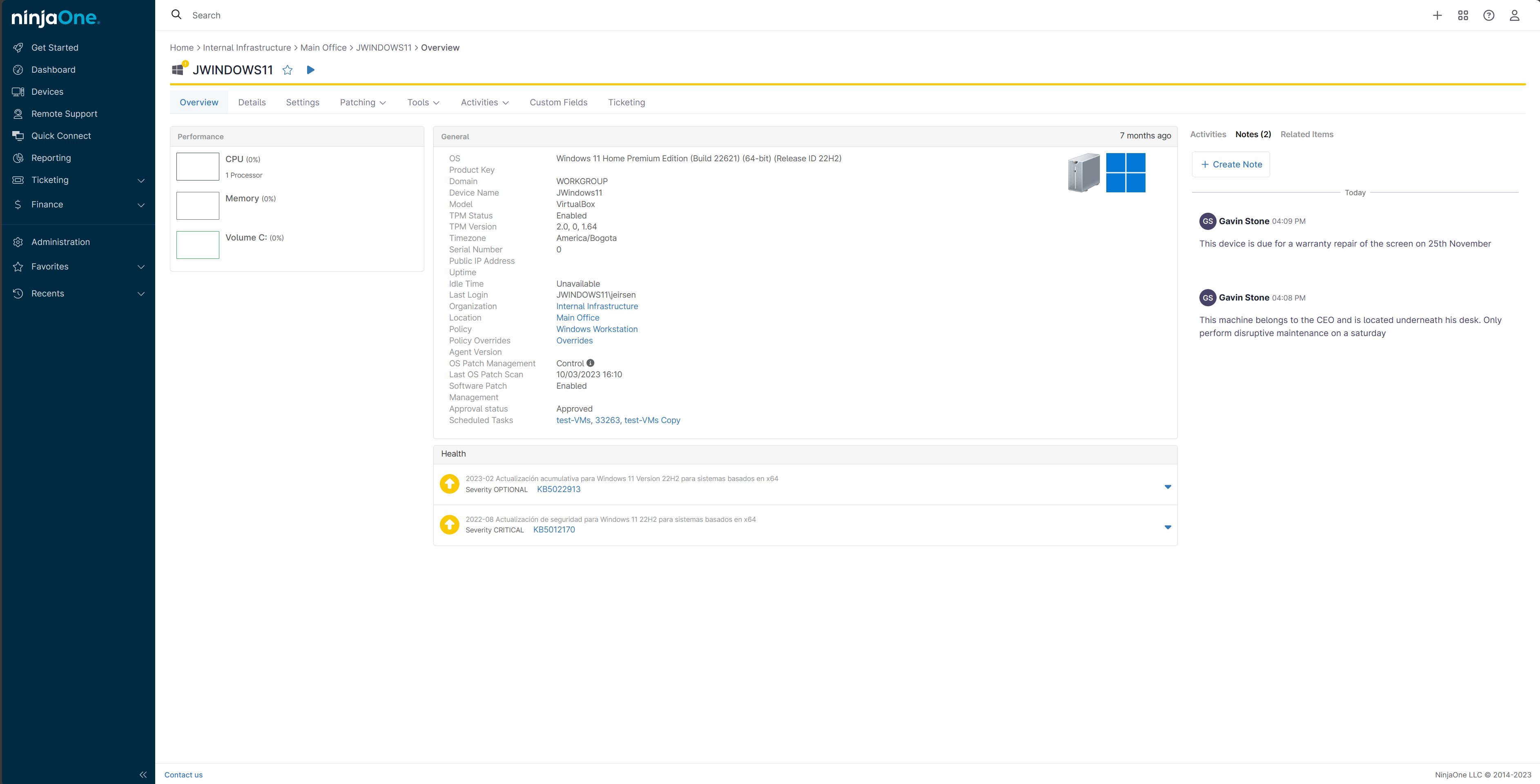 - In the NinjaOne Activity Feed “Notes” tab, technicians can leave multiple notes that include their name and a time stamp so device-specific critical information can be easily shared right at the device level.