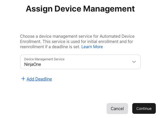 Next, integrate NinjaOne with ABM or ASM. This allows ABM to recognize NinjaOne as a valid MDM server, enabling device assignment and ensuring that devices are under management. At this stage, you should not yet assign devices in ABM to the configured ADE Profile.