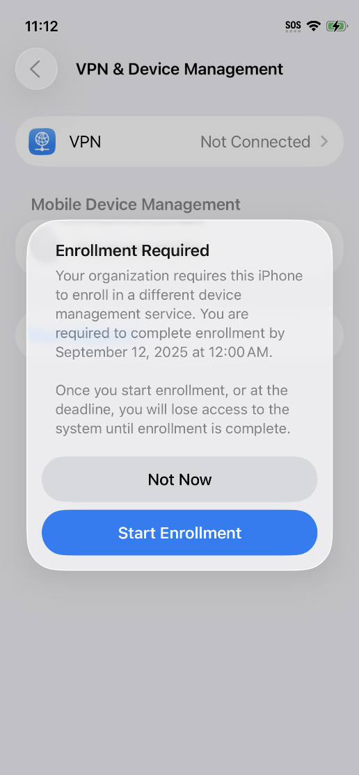 When the migration is initiated, the user will receive a notification on the device. Selecting “Start Enrollment” will bring them to the VPN & Device Management page of the Settings app, where they can initiate the enrollment. If the user selects “Not Now,” they can continue using their device, but will periodically receive a follow up notification. Once the enforcement deadline occurs, the user will be forced to proceed with the migration. When the migration begins, the device will restart.