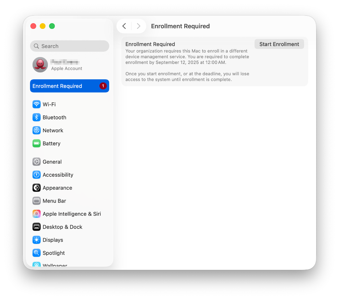 On a macOS device, the process is very similar. When the migration is initiated, the user will receive a notification on the device. They are brought to the System Settings app, where they can initiate the migration. Once the enrollment deadline passes, the user will be forced to migrate.