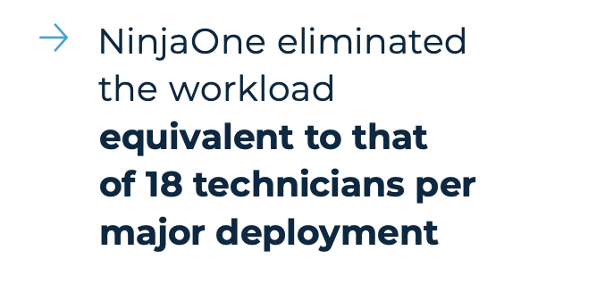 “Because of NinjaOne’s feature set, automations, and overall simplicity, we were not only able to save hundreds of human-hours of manual work, we were able to effectively eliminate the workload equivalent to that of eighteen full-time technicians per major deployment.”