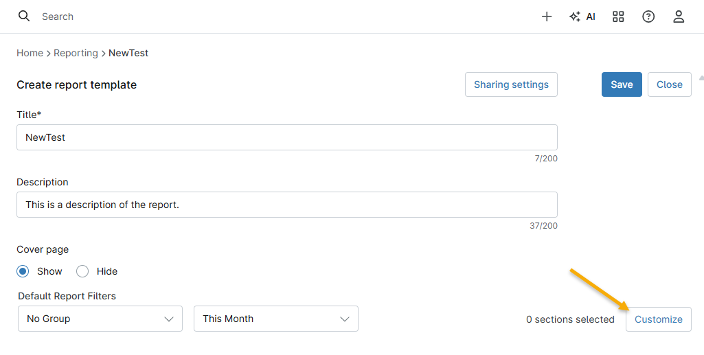- Klicken Sie im Fenster für die Erstellung einer Berichtsvorlage auf Anpassen.