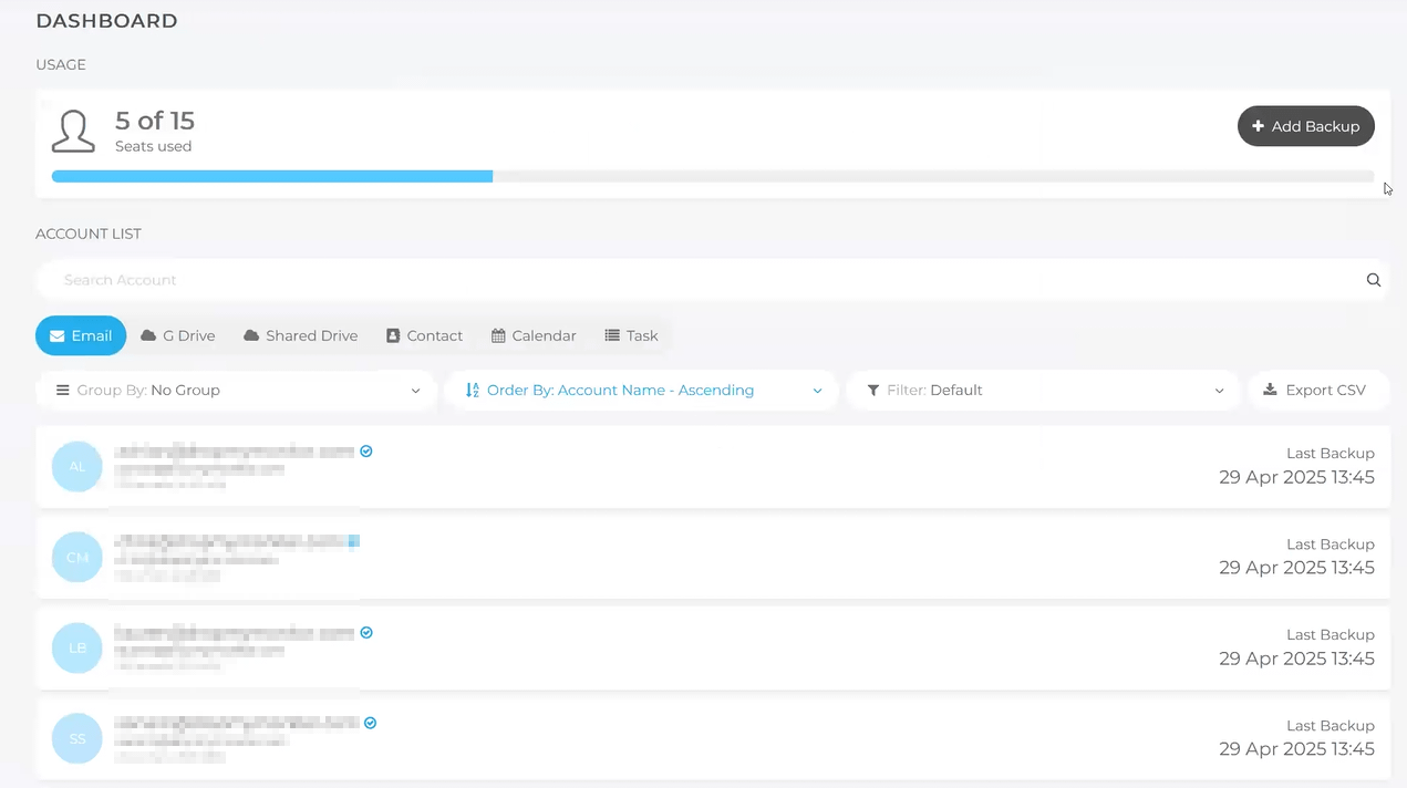 - Navigieren Sie zu der Organisation, für die Sie eine Sicherung von Google Workspace erstellen möchten, und klicken Sie auf Sicherung hinzufügen.
