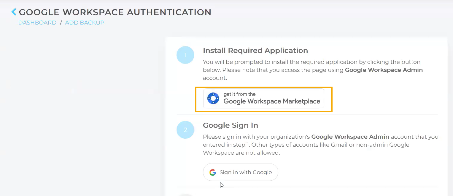 - Installieren Sie die Backup-App, indem Sie auf Get it from the Google Workspace Marketplace klicken.