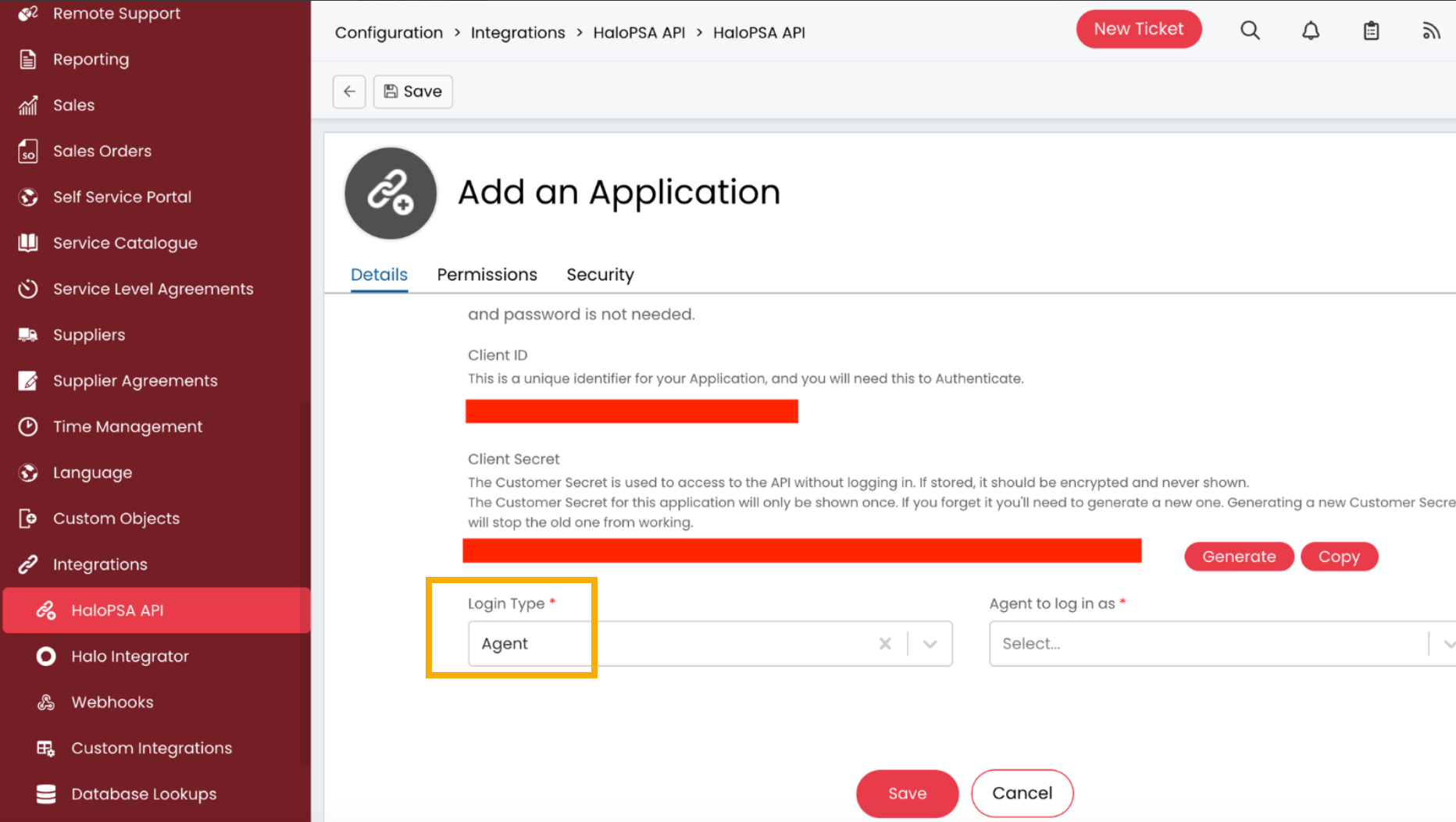 4. Kopieren Sie den Client und das Geheimnis für die spätere Verwendung in diesem Prozess, und das Client-Geheimnis für die spätere Verwendung in diesem Prozess. Stellen Sie dann den Anmeldetyp auf Agent ein und klicken Sie auf Speichern.
