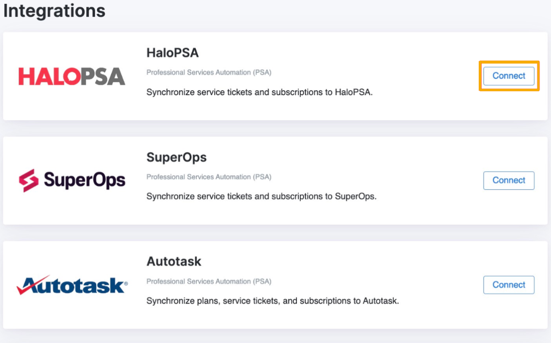 - Klicken Sie auf der Seite Integrationen auf der HaloPSA-Karte auf Verbinden.