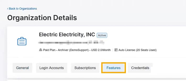 - Navigieren Sie im NinjaOne SaaS Backup Portal zu der Organisation, die Sie sichern möchten, und klicken Sie auf die Registerkarte Funktionen.