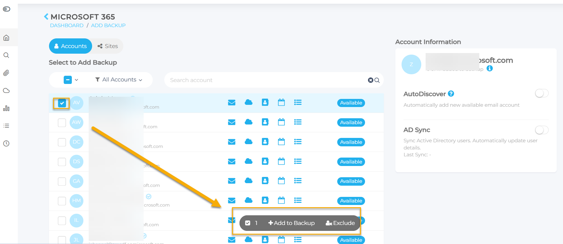 - Verwenden Sie die Option „Alle auswählen“ oder wählen Sie die einzelnen Benutzer aus, die Sie hinzufügen möchten. Auf dem Bildschirm wird die Option „Zum Backup hinzufügen“ angezeigt. Sie haben auch die Option „Ausschließen“ , wenn Sie die ausgewählten Benutzer aus den Backups ausschließen möchten.