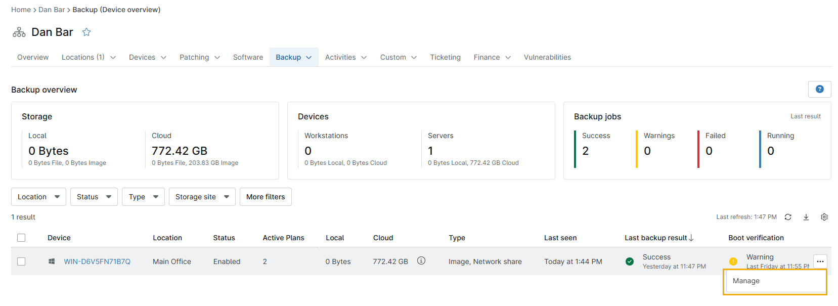 - Bewegen Sie im Dashboard Geräteübersicht den Mauszeiger über das Gerät. Wenn das Menü Aktionen angezeigt wird, klicken Sie auf Verwalten.