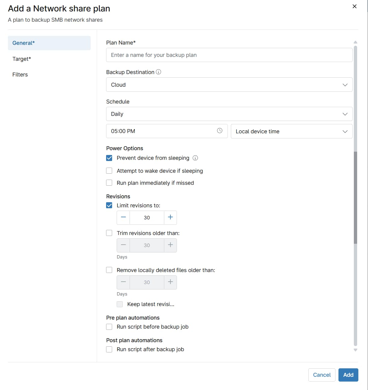 - Konfigurieren Sie auf der Registerkarte Allgemein des Konfigurationsfensters Netzwerkfreigabeplan die folgenden Optionen: