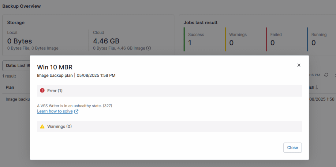 - Führen Sie nach der Reparatur der VSS-Writer eine weitere Sicherung durch und prüfen Sie, ob diese ohne Instabilität der VSS-Writer abgeschlossen werden kann. Wenn das Problem weiterhin besteht, müssen Sie eine Fehlersuche auf Ihrem Windows-Rechner durchführen.