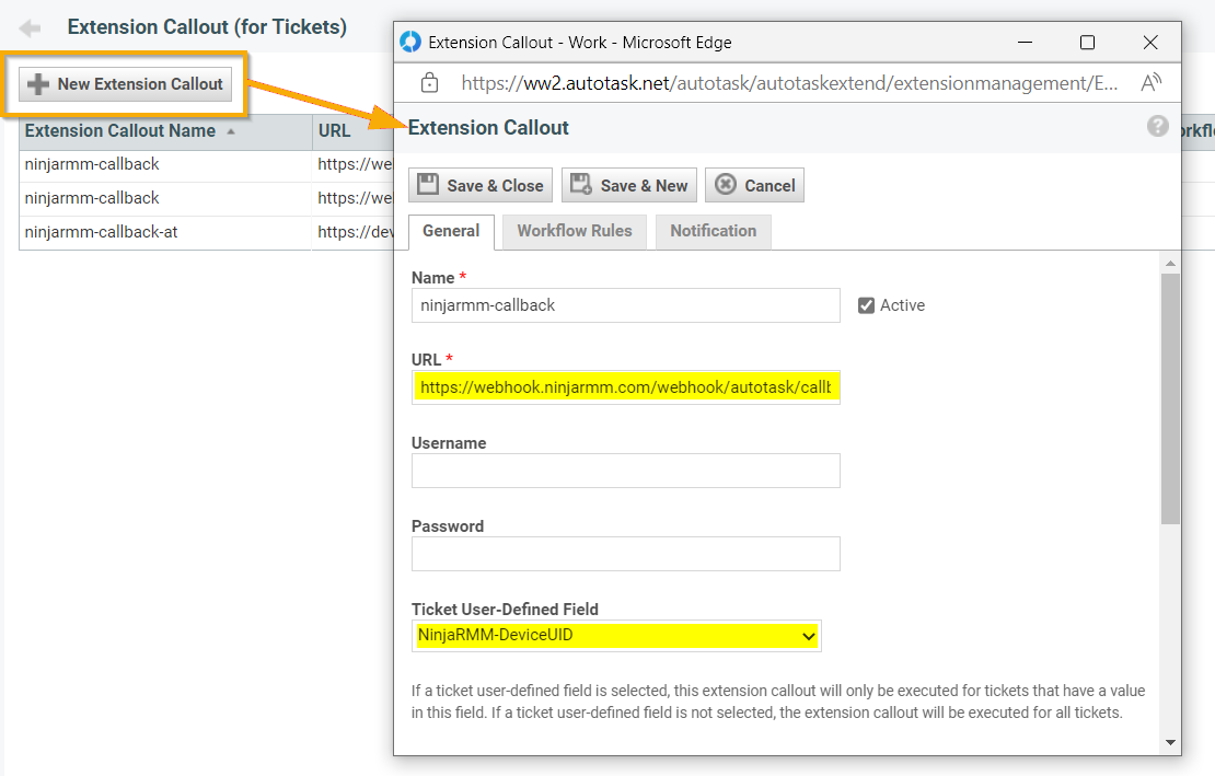 Wenn Sie möchten, dass NinjaOne-Bedingungen zurückgesetzt werden, wenn das zugehörige Autotask-Ticket geschlossen wird, erstellen Sie eine neue Erweiterung auf der Autotask-Seite:
