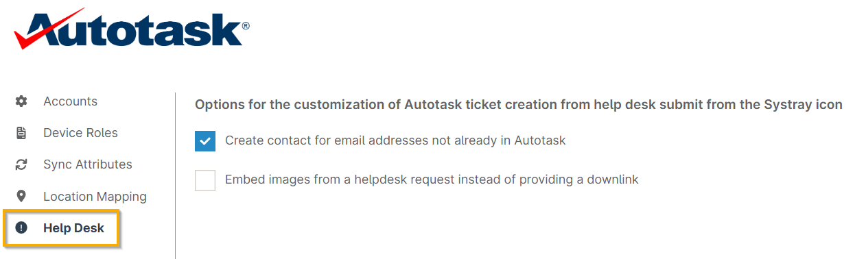 Es gibt zwei Konfigurationsoptionen für die Erstellung von Tickets über das Hilfeanfrageformular im Systray-Symbol. Insbesondere können Sie wählen, ob Sie einen Kontakt für E-Mail-Adressen erstellen möchten, die noch nicht in Autotask vorhanden sind, und ob Sie Bilder in die Anfrage einbetten möchten.