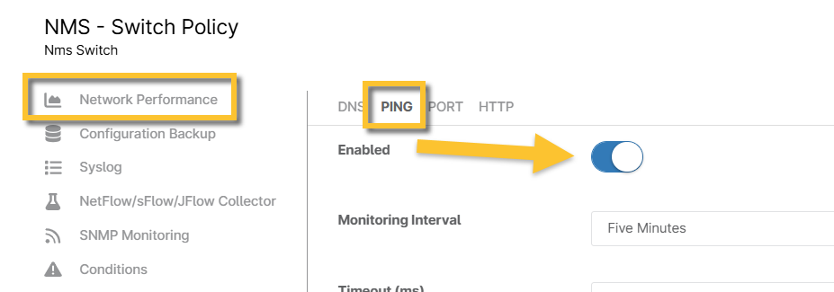 1. Screenshot: NMS-Richtlinienkonfigurationsseite Ping-Aktivierung (zum Vergrößern anklicken)
