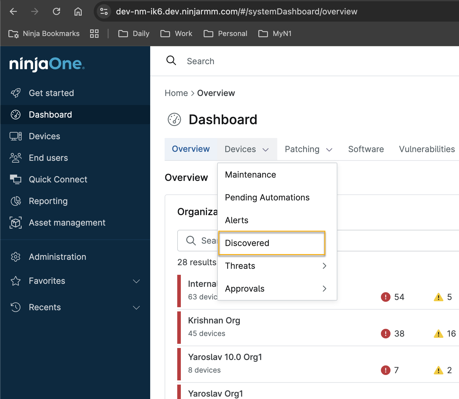 Klicken Sie im NinjaOne-Dashboard auf die Registerkarte „Geräte“ und dann im Dropdown-Menü auf „Erkannt “.