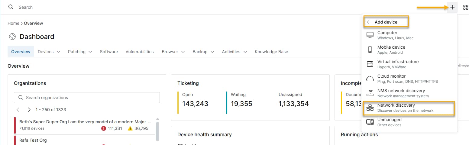 - Klicken Sie in der NinjaOne-Konsole auf das Symbol „+“ und wählen Sie dann „Netzwerkerkennung“ aus.