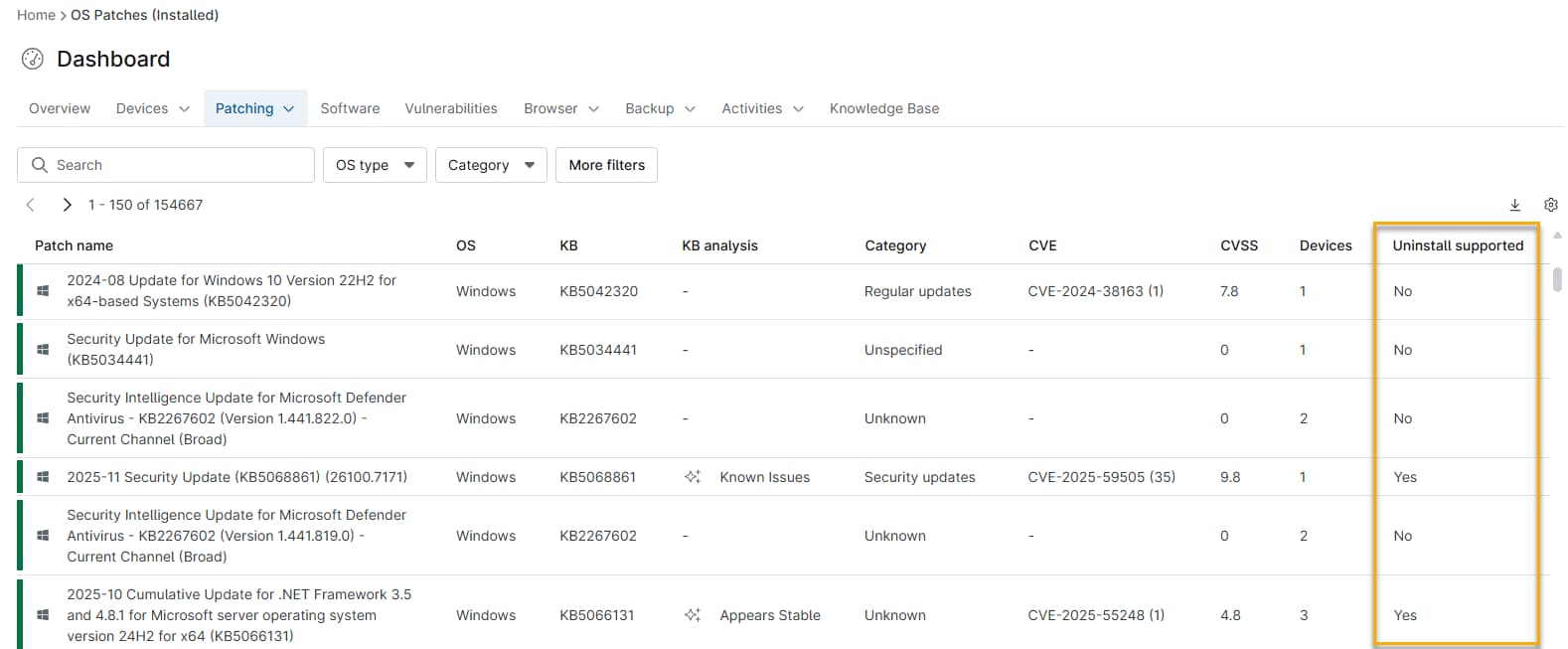 Sie können Windows-Patches, die Rollback unterstützen, über die Liste der installierten Patches in den Dashboards auf System-, Organisations- oder Geräteebene deinstallieren. Die Liste enthält eine Spalte, die anzeigt, ob der Patch Deinstallationen unterstützt. Diese Microsoft Dokumentation(externer Link) beschreibt die Methode, die NinjaOne verwendet, um festzustellen, ob ein Patch Deinstallationen unterstützt.