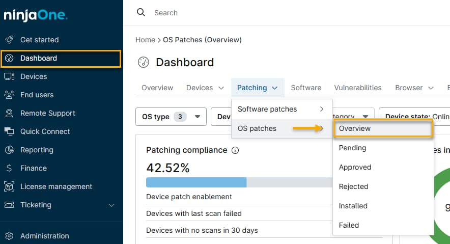 - Klicken Sie in NinjaOne auf Dashboard und wählen Sie dann den Patch-Typ auf der Registerkarte Patching im System-Dashboard aus (entweder aus dem Dropdown-Menü Software oder OS ).