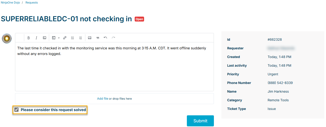 - Klicken Sie auf Senden, um das Ticket an unser Team zu senden. Wenn Sie dies tun, erhalten Sie eine E-Mail an die mit Ihrem NinjaOne-Konto verknüpfte Adresse, in der Sie den Erhalt des Tickets und seiner Details bestätigen.