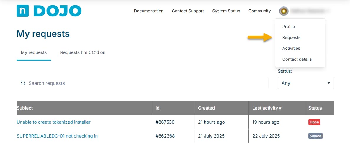 - Sobald Sie ein Ticket erstellt haben oder wir Sie in ein Ticket kopiert haben, können Sie es einsehen, indem Sie auf Ihr Profilsymbol in der oberen Navigationsleiste des NinjaOne Dojo klicken und im Dropdown-Menü Anfragen auswählen.