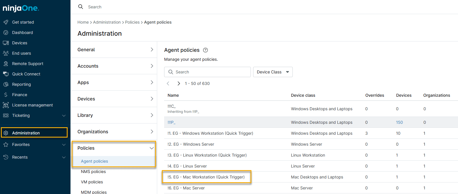 - Navigieren Sie in NinjaOne zu „Administration “→ „Richtlinien“ → „Agent-Richtlinien“ in den erweiterten Optionen und wählen Sie Ihre macOS-Richtlinie aus der Liste aus.