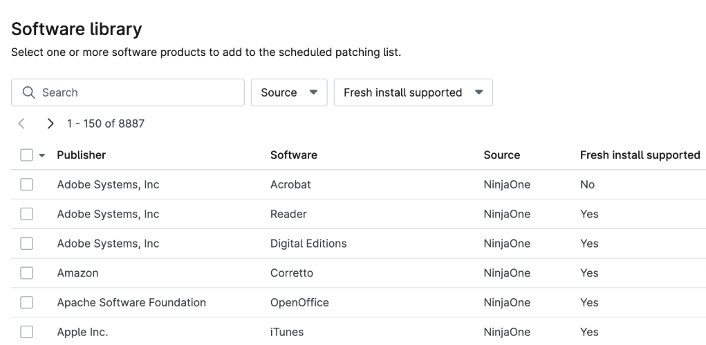 NinjaOne speichert verfügbare Anwendungen in der Softwarebibliothek, die Ihnen die folgenden Informationen anzeigt: