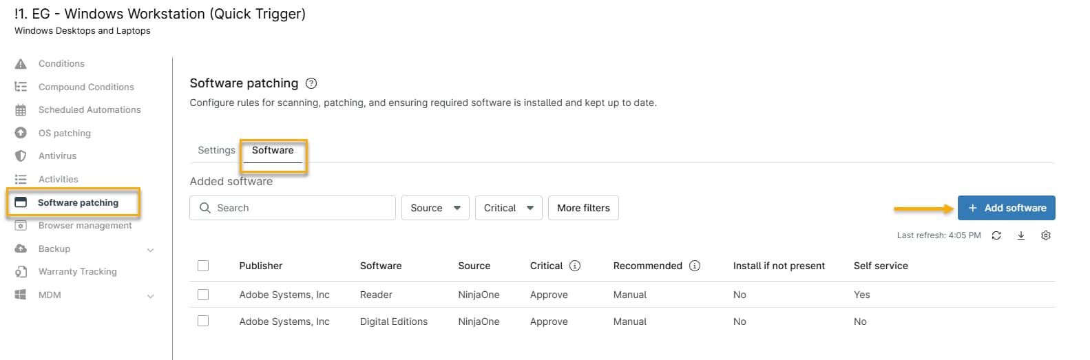 - Navigieren Sie auf der Seite für die Richtlinienkonfiguration zu Software-Patching → Software → Software hinzufügen.