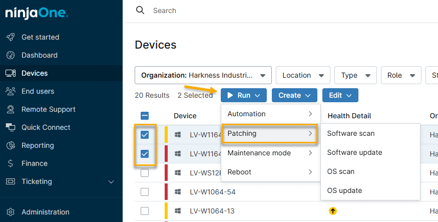 - Setzen Sie den Cursor auf die Schaltfläche Ausführen, und wählen Sie Patchen → Software-Aktualisierung Software-Scan (um nach neuen Patches zu suchen) oder Software-Aktualisierung (um vorhandene Patches anzuwenden). NinjaOne zeigt den Drittanbieter-Patching-Status auf Geräteebene an. Wenn Sie eine patches auf manuelles Genehmigen oder Ablehnen eingestellt sind, können Sie diese Aktionen von die Geräteübersicht.