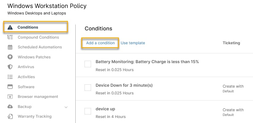 Führen Sie die folgenden Schritte aus, um überwachte Bedingungen in NinjaOne zu konfigurieren: