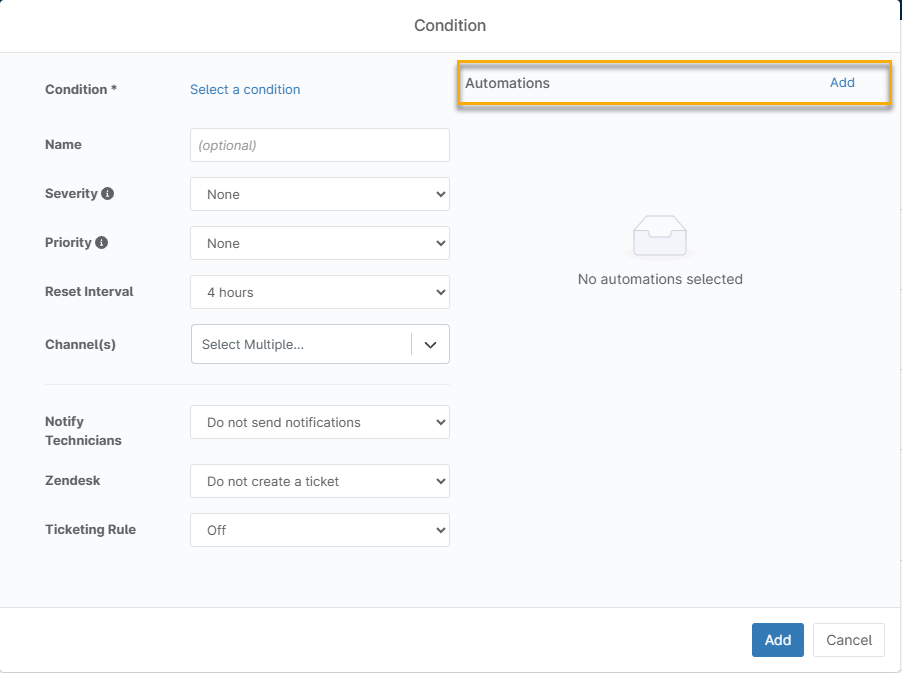 Wenn die Bedingung ausgelöst wird, können Sie ein Skript hinzufügen, um eine Anwendung zur Fehlerbehebung zu installieren oder auszuführen. Klicken Sie im Abschnitt Automatisierungen des Fensters Bedingungen auf Hinzufügen. Diese Aktion zeigt eine Liste aller nativen Skripten sowie Skripten an, die Sie über die NinjaOne Automatisierungsbibliothek hinzugefügt haben.