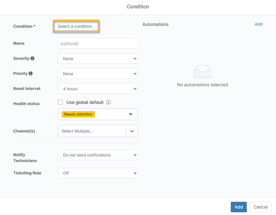 - Das Dialogfeld „Bedingungskonfiguration“ wird geöffnet. Klicken Sie auf „Bedingung auswählen“ und geben Sie die zu überwachende Bedingung an. Eine vollständige Liste aller verfügbaren Bedingungen finden Sie unter NinjaOne-Richtlinien: Aufschlüsselung der Bedingungstypen.