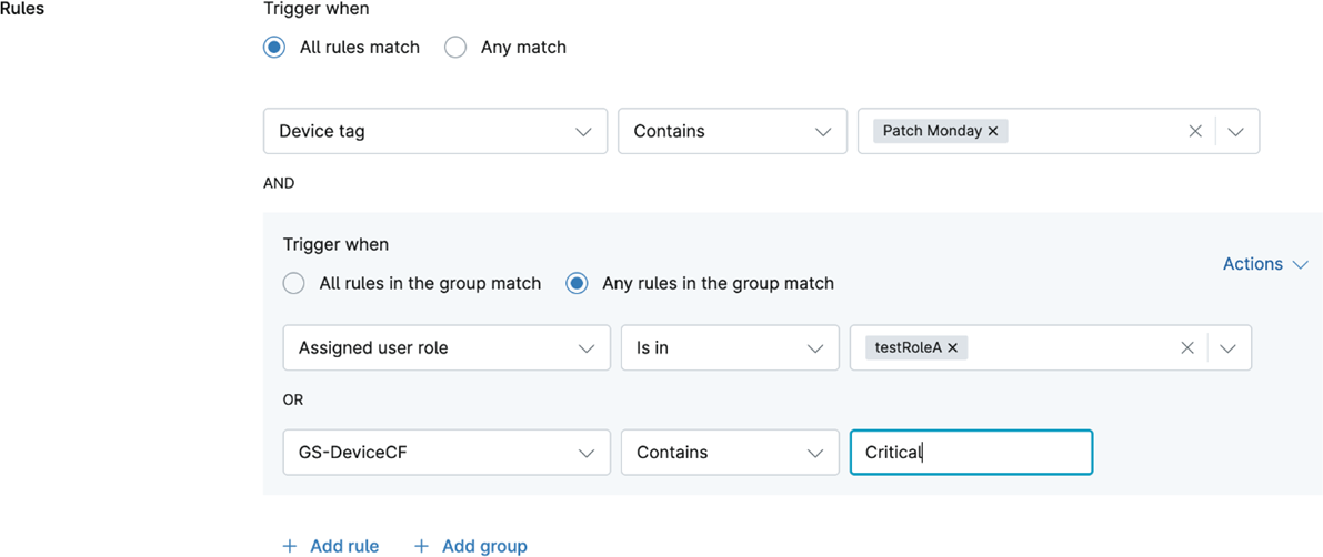 Beispielsweise weist die Regel in Abbildung 9 NinjaOne an, Folgendes auszuführen: "Ziele auf alles ab, auf dem das Geräte-Tag Patch Monday vorhanden ist UND (die zugewiesene Benutzerrolle lautet testRoleA ODER das benutzerdefinierte Feld GS-DeviceCF enthält den Wert Kritisch)."
