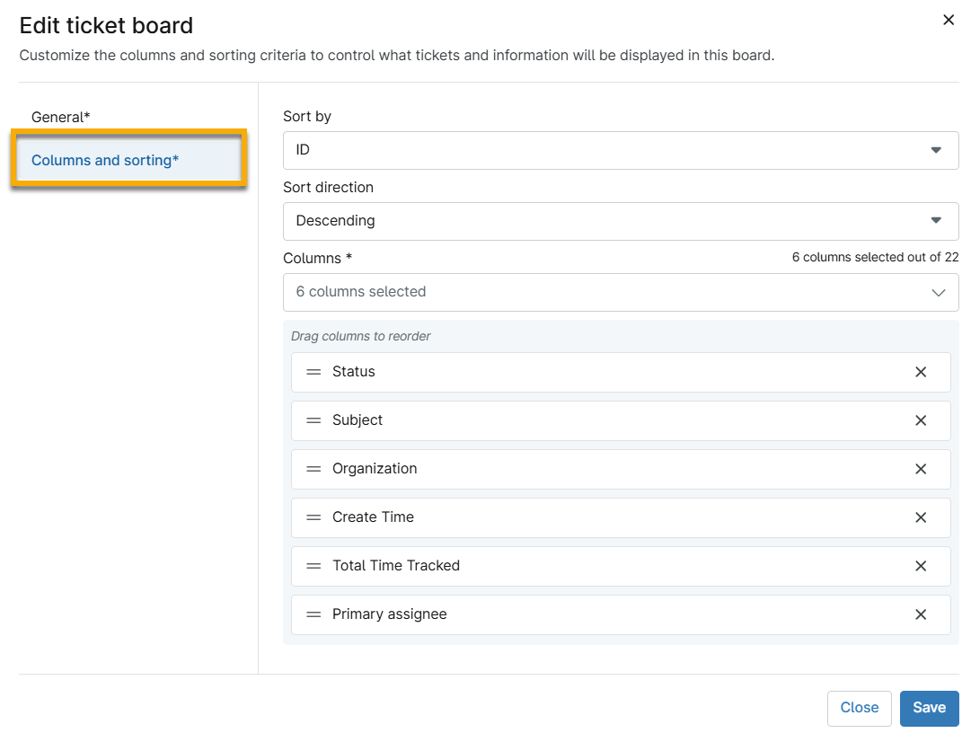 Sie können den Abschnitt Spalten und Sortierung verwenden , um die Tickets nach einer Vielzahl von Daten zu organisieren, z. B. nach Standort, Gerät, Erstellungsdatum, Aktualisierungszeit und mehr. Zudem können Sie Spalten hinzufügen oder entfernen und deren Reihenfolge ändern.