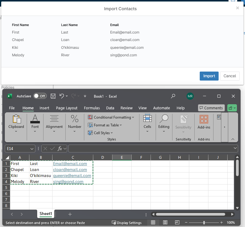 - Sie können Kontakte in großen Mengen für die Organisation durch Kopieren und Einfügen aus einer CSV-Tabelle importieren. Gemäß den Anweisungen müssen die Daten in drei Spalten in der folgenden Reihenfolge eingegeben werden: Vorname, Nachname und E-Mail-Adresse. Alle Spalten müssen ausgefüllt werden, und die E-Mails müssen eindeutig sein.