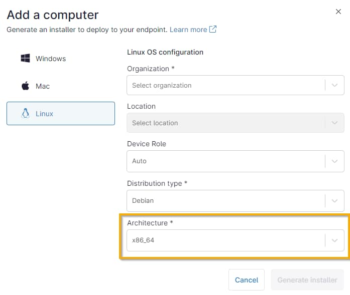 Um ein Raspberry Pi-Betriebssystemgerät zu NinjaOne hinzuzufügen, befolgen Sie die Schritte in unserem Artikel NinjaOne-Agent installieren: Gerät hinzufügen (Linux). Wählen Sie bei der Aufforderung "Raspberry Pi" aus dem Dropdown-Menü "Architektur" aus.