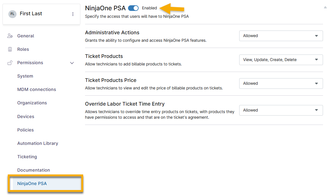 1. Screenshot: NinjaOne → Verwaltung → Konten → Techniker → NinjaOne PSA Berechtigungen → Zugriff aktivieren und erlauben (zum Vergrößern anklicken)