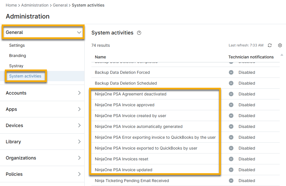 Leiten Sie Ereignisse an Benachrichtigungskanäle oder Techniker weiter oder erstellen Sie Ticketing-Regeln unter Verwaltung → Allgemein → Systemaktivitäten. Weitere Informationen zum Erstellen von Warnungen oder Benachrichtigungen für diese Aktivitäten finden Sie in unserem Artikel Benachrichtigungs-Feed für Geräte- und Systemaktivitäten.