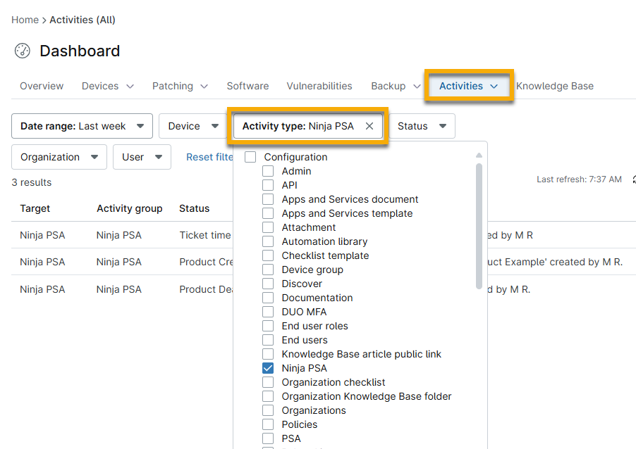 8. Screenshot: Aktivitäten im Dashboard für NinjaOne PSA filtern (zum Vergrößern klicken)