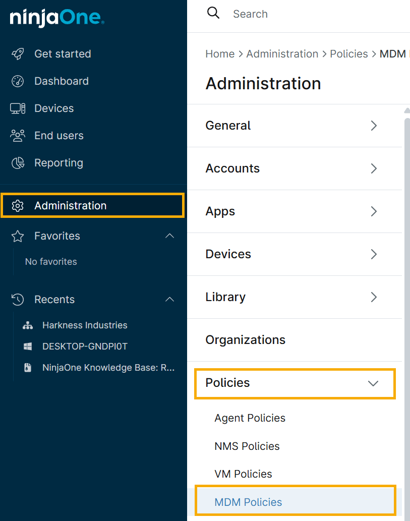 - Klicken Sie im linken Navigationspanel auf Administration, öffnen Sie dann das Dropdown-Menü Richtlinien und wählen Sie MDM-Richtlinien.
