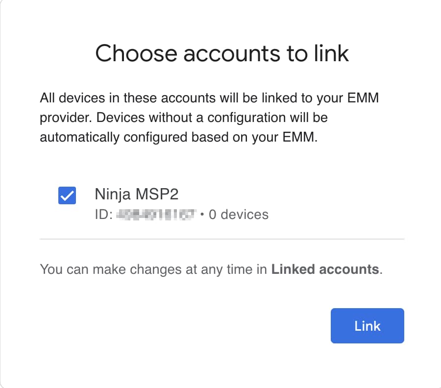 - Klicken Sie auf „Weiter zu Google“, wählen Sie die Konten aus und klicken Sie auf „Verknüpfen“. Google bestätigt, dass Ihr Zero-Touch-Konto über den Android Device Policy Controller (DPC) mit NinjaOne MDM verknüpft ist.