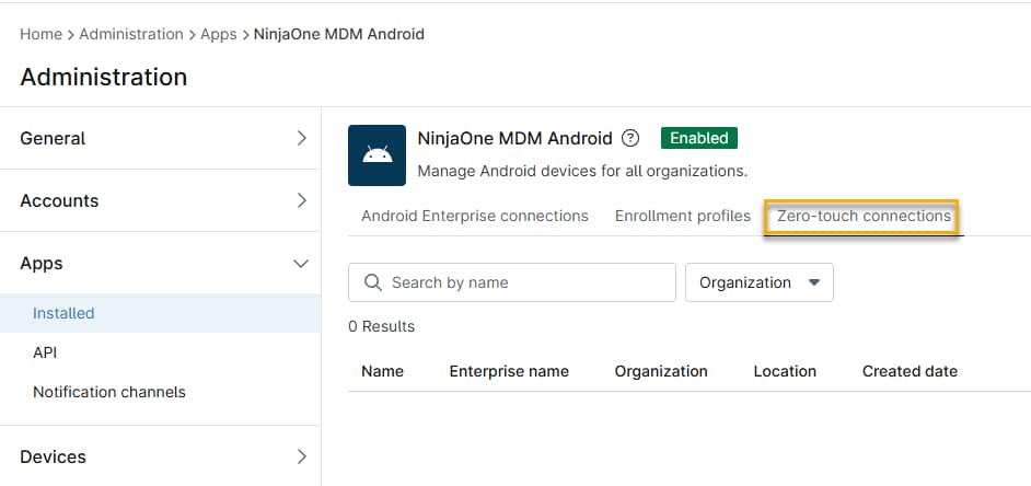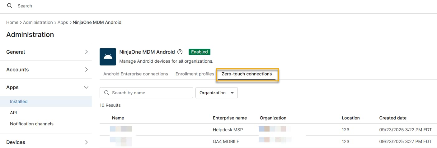 NinjaOne zeigt Ihre Verbindung inNinjaOne Mobile Device Management (MDM) unter „Android“ → „Zero-Touch-Verbindungen“ an .