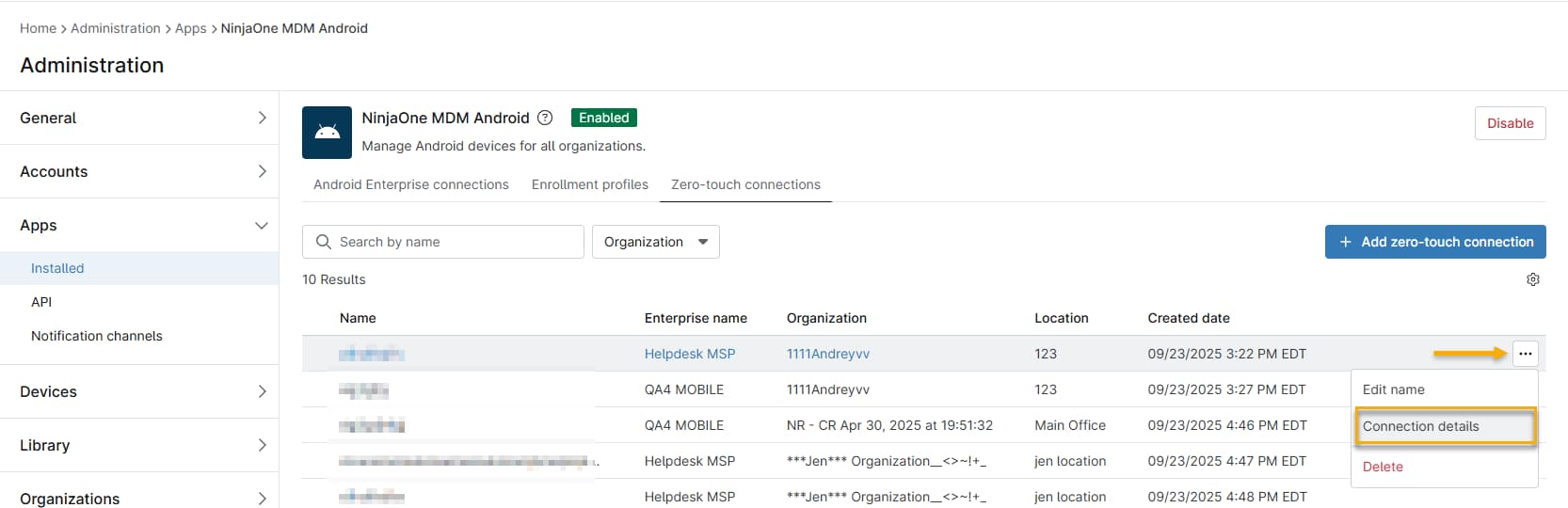 Klicken Sie auf der NinjaOne MDM Android-Seite auf eine Verbindung und wählen Sie dann „Verbindungsdetails“ aus dem Dropdown-Menü, um zum Dialogfeld „Zero-Touch-Verbindungskonfiguration“ zurückzukehren.