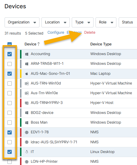 - Deinstallieren Sie von der Gerätesuchseite aus: Löschen Sie ein oder mehrere Geräte, unabhängig von deren Organisation. Der NinjaOne-Agent bleibt auf allen anderen Geräten auf der Konsole installiert, unabhängig von deren Organisation oder Typ.