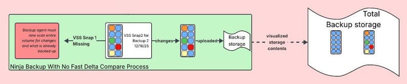 Problems occur if the VSS Snapshot from the prior backup job is missing or unreadable; the backup agent must scan the entire hard drive to determine what has changed. Additionally, when we discover which blocks have changed from this scan, we cannot determine which pieces have changed within the block and must therefore back up the entire block again.