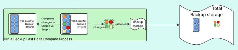 NinjaOne Image backup uses VSS snapshots of a hard drive to send data to backup storage. Image backup always attempts to retain the previous snapshot of the last backup job and then takes a new snapshot of the current running job. By having the last snapshot available, the backup agent knows exactly which blocks have changed and only needs to back up those changes, without scanning unchanged blocks. Additionally, there are 'pieces' of data inside each block of backup data, and we track these pieces as well. Keeping the last VSS Snapshot means the backup engine only needs to upload changed pieces and not the entire block.