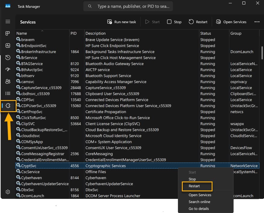 - Right-click the service that corresponds to the unstable VSS writer and select Restart.